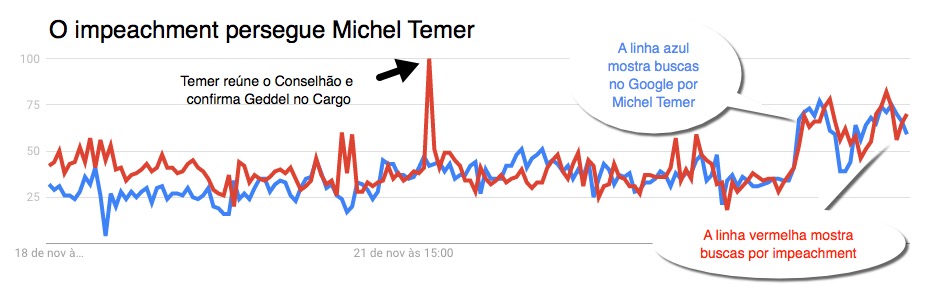 O gráfico abaixo mostra o volume de buscas no Google pelos termos “Michel Temer” e “Impeachment” na última semana. Os dois têm andando juntos nas redes desde que a denúncia do agora ex-ministro da Cultura, Marcelo Calero, deu o pontapé inicial para uma crise que culminou na demissão de Geddel Vieira nesta 6af (25/11). Nas redes sociais a história é a mesma, quase 30% dos tuítes que falam de Temer citam impeachment.