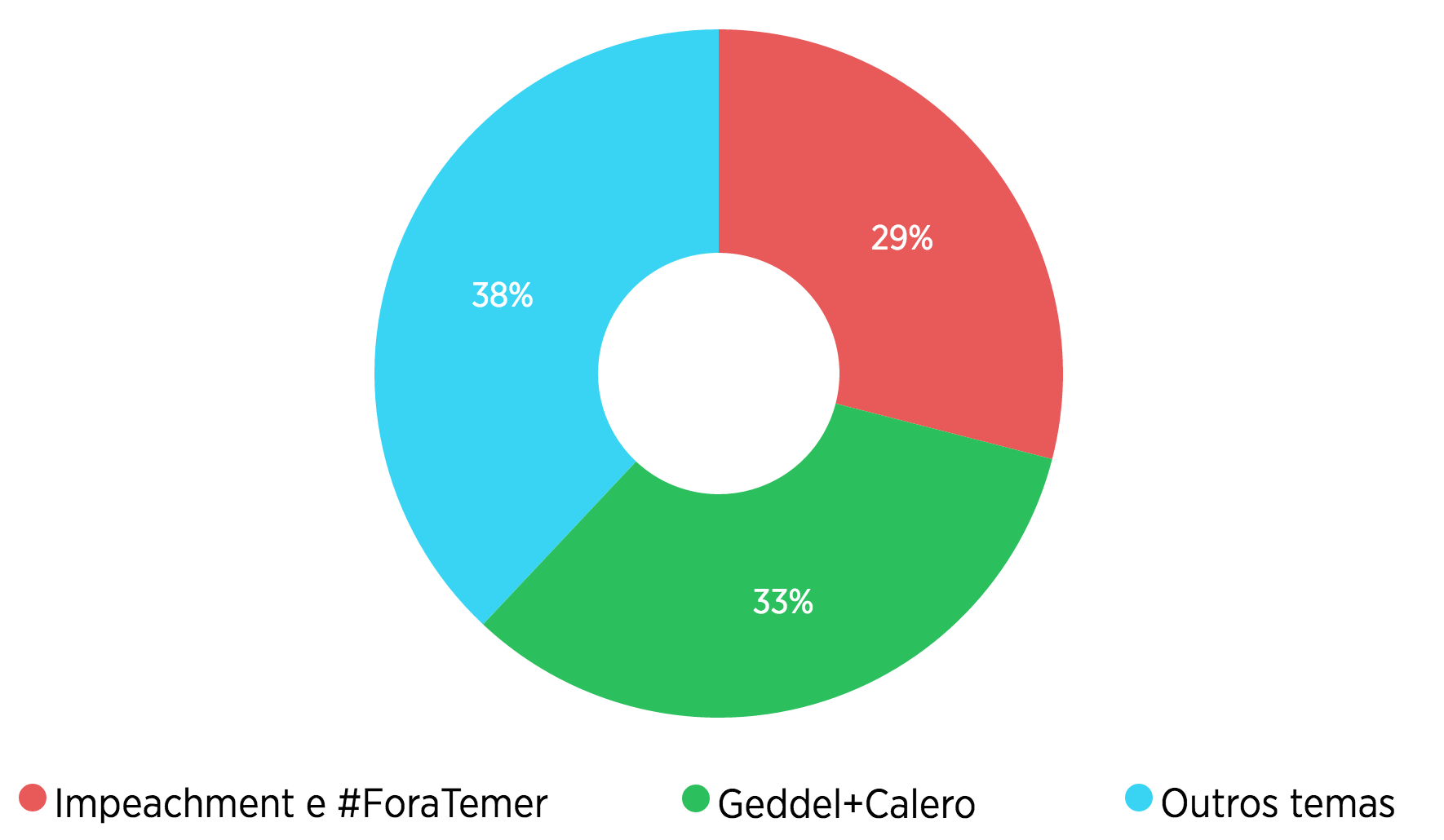 A Medialogue analisou 15 mil tuítes que fizeram referência a Michel Temer nos últimos três dias e fez algumas descobertas. Cerca de 1/3 das menções fazem referência à crise vinculada a Geddel Vieira e outros 38% são postagens que não agregam grandes assuntos. Até aí, é o esperado. O que chama a atenção é que quase 30% de toda a conversa fala de impeachment, pede que Temer renuncie ou usa as hashtags #ForaTemer e #VazaTemer.